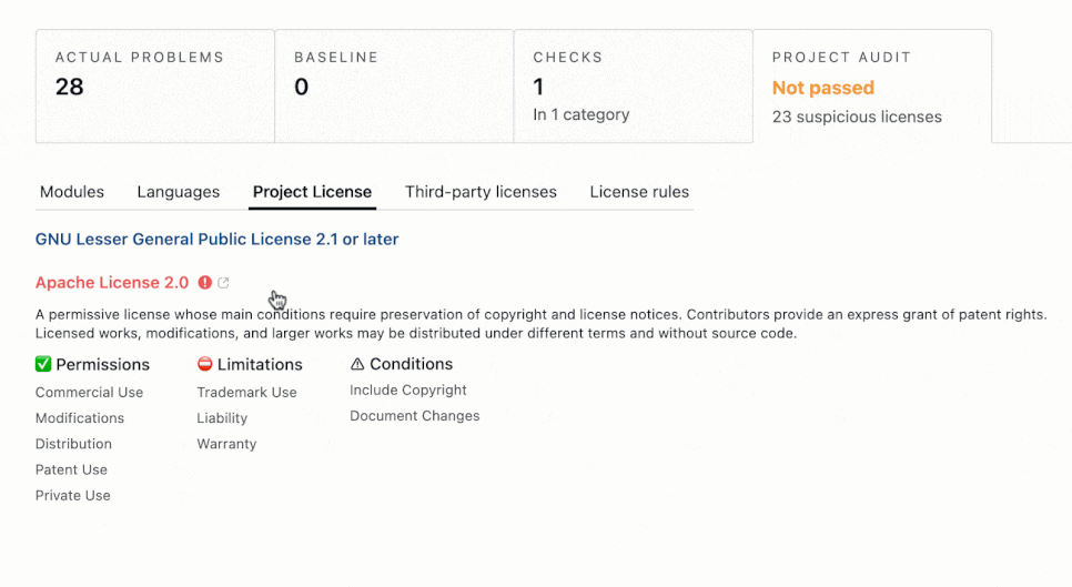 코드 저장소에서 종속성을 검색하여 라이선스를 검색하고 잠재적인 문제가 있는지 확인받을 수 있으며 라이선스 감사 기능은 Java,Kotlin,PHP,Python,JavaScript에서 지원한다.