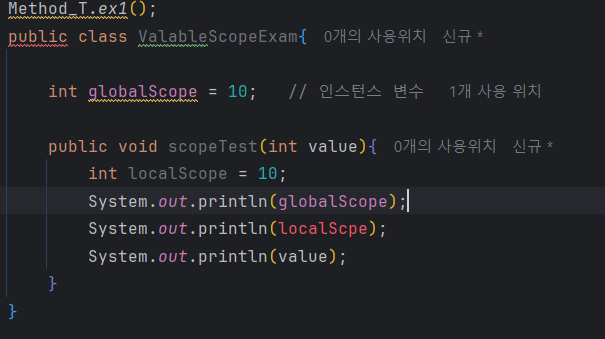 public class ValableScopeExam{ int globalScope = 10; public void scopeTest(int value){ int localScope = 10; System.out.println(globalScope); System.out.println(localScpe); System.out.println(value); } }다음 코드에서 보듯 'globalScope'변수는 메서드 밖에서 선언했고 'localScpe'변수와 'value'변수는 메서드 안에서 선언되었다.